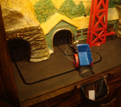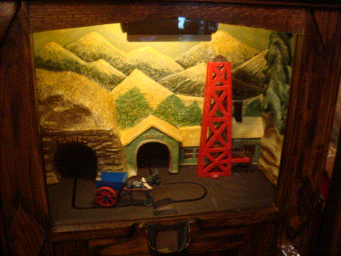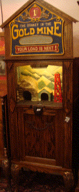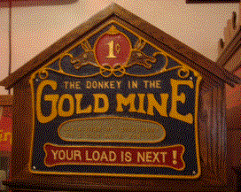 Gold Mine Card VendorBeautifully remade limited edition version of the early 1900s-1920 Gold Mine arcade machine.Insert coin, watch the cart come out of the gold mine with a card in its cart, travel to the front of the machine, tilt the cart to deposit the fortune card into the chute, and then the cart goes back into the mine. See Close Up Photo of Cart and see Close Up Photo of Cart Dropping a Card into the Chute
