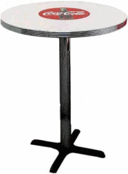 Coca Cola Round Diner TableThis table with a coke emblem on it has a 30" round top and stands 29" tall. Matching chairs shown above. The table is made in the USA. There is minor assembly.