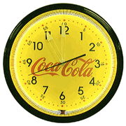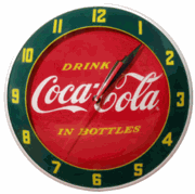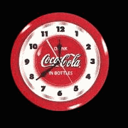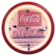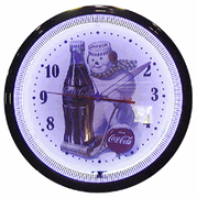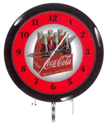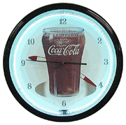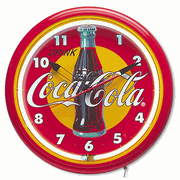 Coca Cola 20"Bottle Neon ClockHand constructed of spun aluminum in COKE Red this clock has a glass front, a brass electric clock movement and a vivid glowing neon tube that lasts approximately 100,000 hours (approximately 12 years). This neon clock is beautifully embossed with the COCA-COLA Contour Bottle and the COCA-COLA Script Trademark. 1 year warranty on all parts and labor. Approx. 20" diameter.Price: is $399 plus $65 shipping